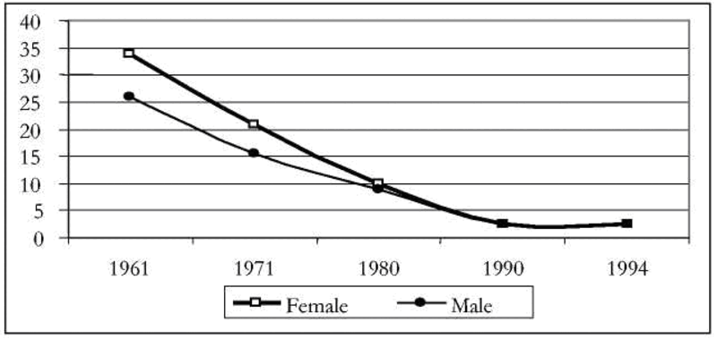 Figure 5: Illiteracy rates among population aged 10-14 year old, 1961-1994