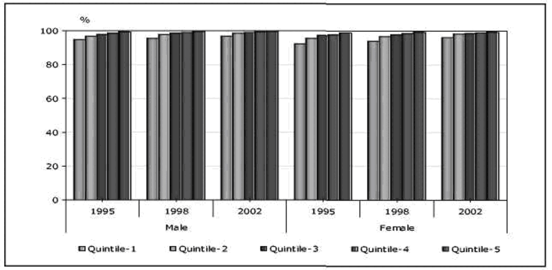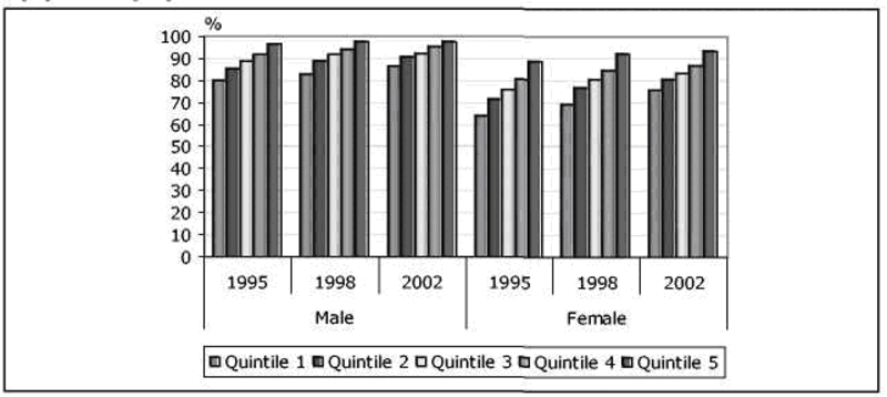 The literacy level of the female population has significantly increased across the years in all poverty quintiles. If we compare literacy rates of the male population between 15-24 years of age with those of females falling into the same age group, we can see that their literacy rates are not significantly different. However, measured according to their income, it is revealed that the literacy rates of the female population aged 15-24 are still much lower in comparison to those of the male population. In 1995, when the literacy rate of the poorest male population (quintile-1) was only 80 percent, the literacy rate of the richest male population (quintile-5) had reached 96.2 percent. Literacy rates of all groups increased consistently over time, so that by 2002, the poorest group reached 86.6 percent, while the wealthiest group rose to 97.9 percent. At the same time, literacy rates for the female population (of all groups) also increased remarkably. While the literacy rate of the poorest group increased from 64.2 percent to 75.7 percent,