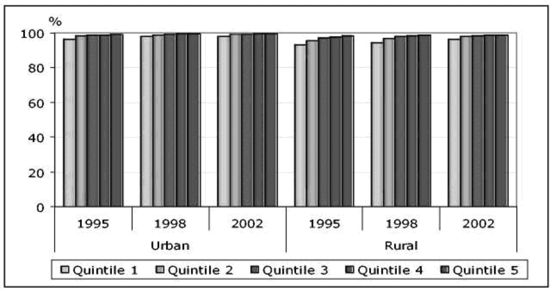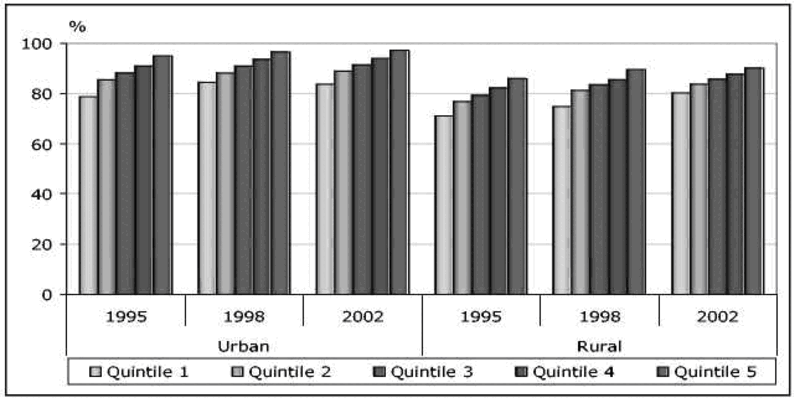 Figure 8 reveals that the literacy rate of the urban population is generally higher than that of the rural population in all income groups. Nevertheless, the literacy rates of the urban and rural populations simultaneously increased during 1995 to 2002. While in 1995 the literacy rate of the poorest population group aged 15 years and above in urban areas was 78.8 percent and the richest group 95.0 percent, in 2002 the literacy rate increased to 83.7 percent for the poorest group and 97.2 percent for the richest group.