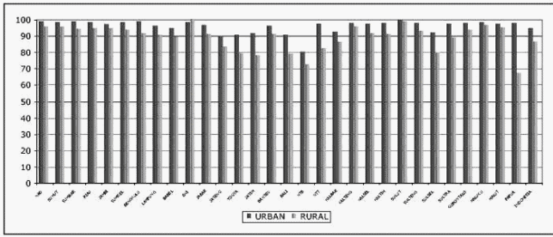 In 2003, there was little discrepancy among provinces in the literacy rate for the population aged 15-24 years except in NTB, NTT, South Sulawesi (Sulsel) and Papua provinces (Figure 11). The literacy rate in urban areas for all provinces ranged between 97.4 percent (NTB) and almost 100 percent (North Sulawesi); meanwhile in rural areas the rate ranged between 79.3 percent (Papua) and 99.7 percent (North Maluku).