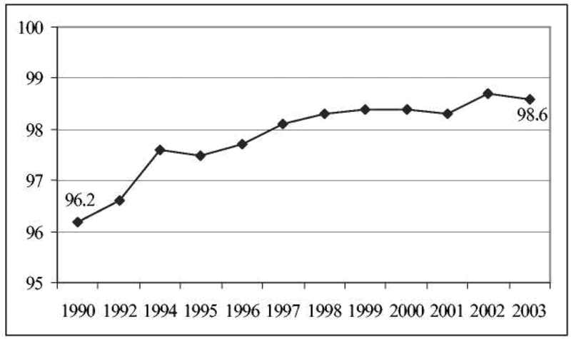Figure 6: Trend of the literacy rate of the population aged 15-24 years, 1990-2003