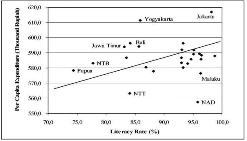 Cross-section data among provinces in 2002 indicates that the literacy level had a positive correlation with the economic status of the community measured by per capita expenditure (Figure 2).