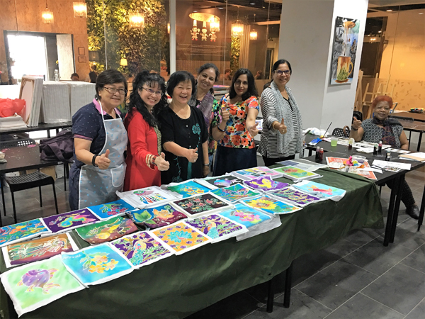 The volunteer facilitator Ms Amita (second from right) and her class participants are presenting creative batik paintings, © Thomas Kuan