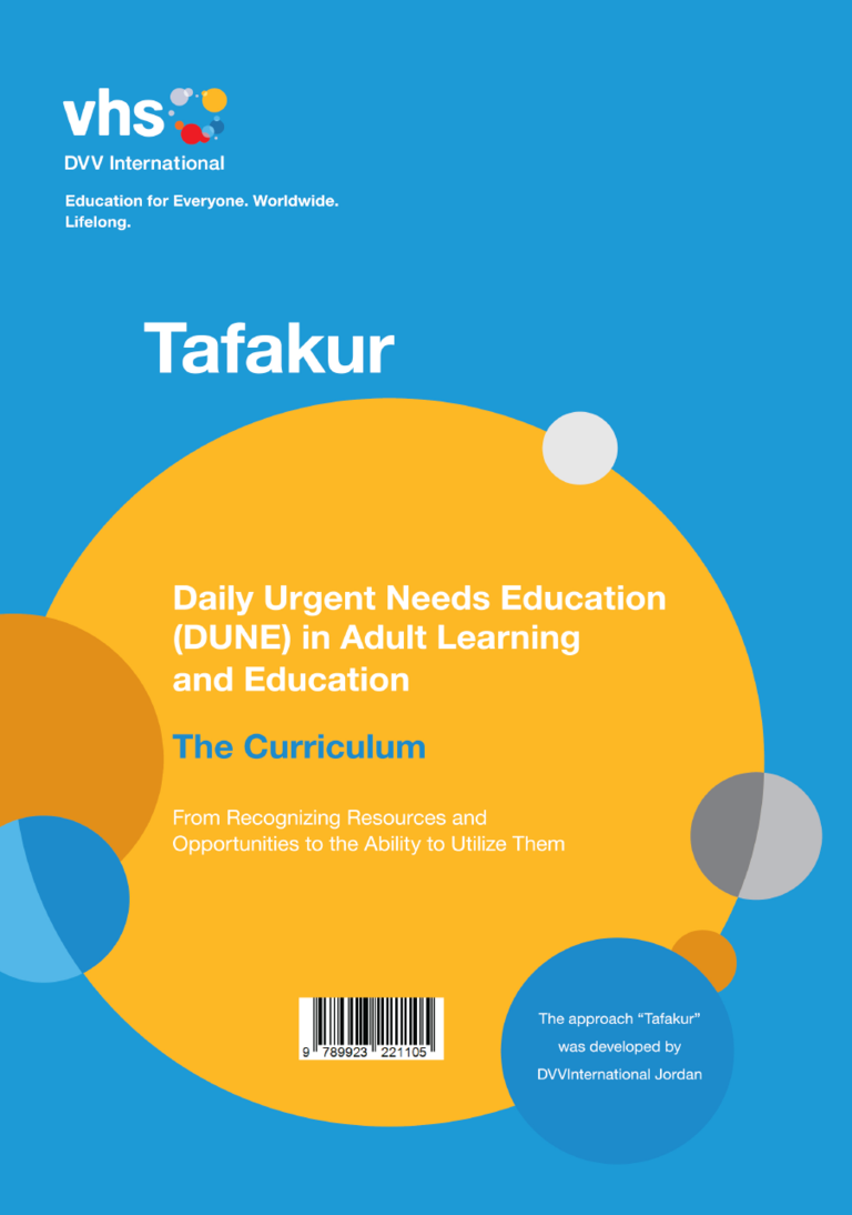 The Tafakur–DUNE approach is an adult learning and education approach developed by DVV International Jordan that aims to empower individuals and communities by linking learning directly to people’s daily lived realities. DUNE (Daily Urgent Needs Education) is the conceptual framework that uses learners’ most pressing social and economic challenges—such as unemployment, marginalization, or lack of livelihood opportunities—as the starting point for education. Learning begins with real-life issues that learners experience in their everyday lives, making education relevant, purposeful, and connected to action.