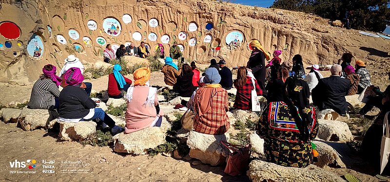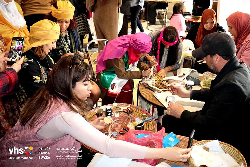 DVVI and the cultural centre of Jebel Semmama recently collaborated to organize the Twiza event. This three-day activity in March 2023 consisted of workshops, reflections, shows, and exchanges. It brought together Tunisian and Algerian participants for an experience of sharing and discovering new practices and approaches. It opened with the “El Mahfel” parade, featuring mountain rhythms and bouquets of rosemary and white wormwood.
