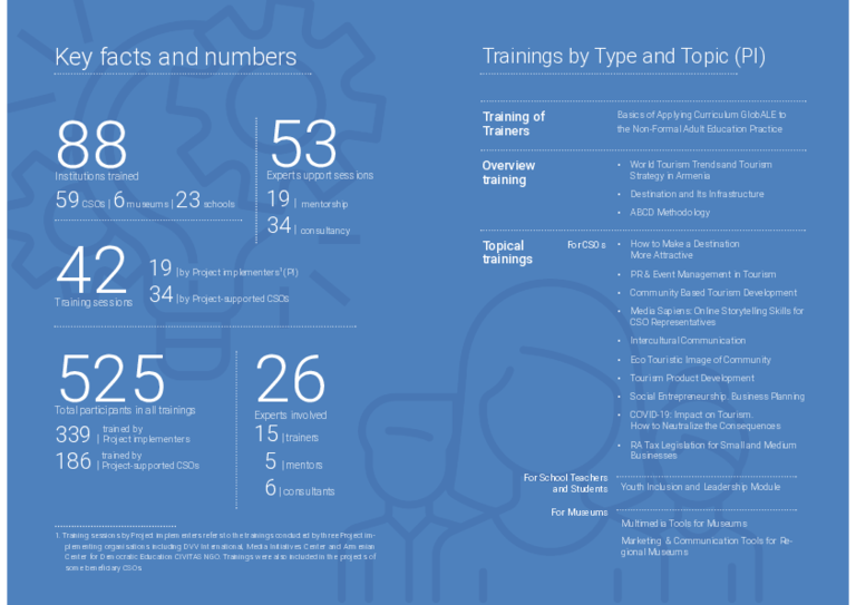 A consortium consisting of DVV International and the three local partnering NGOs, Media Initiatives Centre, Armenia Centre for Democratic Education CIVITAS and the Association of Museum Workers and Friends was able to successfully implement the project despite the COVID-19 pandemic and the 44-day military conflict over the Nagorno-Karabakh region in 2020.