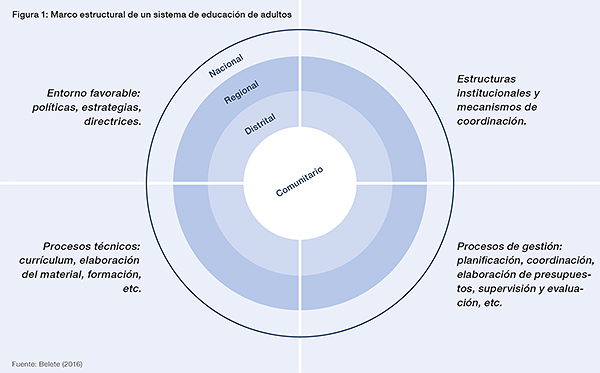 La educación de adultos o el aprendizaje a lo largo de toda la vida se inscriben dentro del marco operativo del sistema de educación de adultos de un país. La experiencia en Etiopia, Uganda y otros países africanos ha demostrado que la competencia de los educadores de adultos para planificar programas que satisfagan las necesidades de los grupos destinatarios no es suficiente. Otro factor decisivo es la capacidad de los educadores de adultos para considerar otros factores y actores influyentes fuera del ámbito de su especialidad técnica, para así garantizar que estos programas puedan impartirse efectivamente al grupo destinatario. Ello implica que los educadores de adultos deben planificar conjuntamente con con los así llamados “administradores de sistemas”. Estos pueden ser especialistas de los departamentos de planificación y finanzas de instituciones públicas o privadas o de ONG. Si los programas de educación de adultos tienen un alcance multisectorial, se requiere también la cooperación de especialistas técnicos de diferentes campos. Figura 1 (página 39) entrega una visión general de los principales componentes de un sistema de educación de adultos en los distintos niveles administrativos que existen en un país. Ellos constituyen el marco y el trasfondo operativo para cualquier educador de adultos que planifique programas y ofertas de formación.