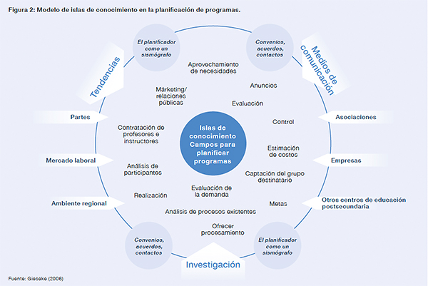 ¿A qué nos referimos cuando hablamos de planificación de programas como competencia clave? La planificación profesional de un programa incluye todas las actividades necesarias para desarrollar programas, cursos de educación individual o proyectos. Se trata de encontrar temas, formular ofertas y agrupar distintos contenidos de programas, e incluso de armonizar los perfiles de organizaciones de educación de adultos o educación postsecundaria. La planificación de programas consolida las estructuras curriculares y proveedoras de las organizaciones de educación de adultos y postsecundaria; incluso, y por sobre todo, legitima la organización como tal (Käpplinger y Robak 2017). Nuestras investigaciones sobre la planificación de programas revelan cómo se generan los programas integrales, cómo influyen las políticas en los programas y en los procesos de planificación de los mismos, cómo los profesionales encargados de los procesos de planificación de programas equilibran diversos aspectos (por ejemplo, los requerimientos, las necesidades y los intereses de aprendizaje) y, por último, cómo miden las competencias y las capacidades de los distintos grupos destinatarios. Nuestras investigaciones también demuestran que las misiones educativas y extraeducativas del proveedor influyen en los procesos de planificación de programas; por ejemplo, los centros de educación de adultos tienen una concepción de la educación que difiere de aquella que tienen las instituciones administradas por iglesias y sindicatos. Asimismo, las visiones y convicciones (contenido, pedagogía, ética) de las instituciones de educación de adultos de los planificadores de programas profesionales se ven reflejadas en los procesos de planificación de programas.