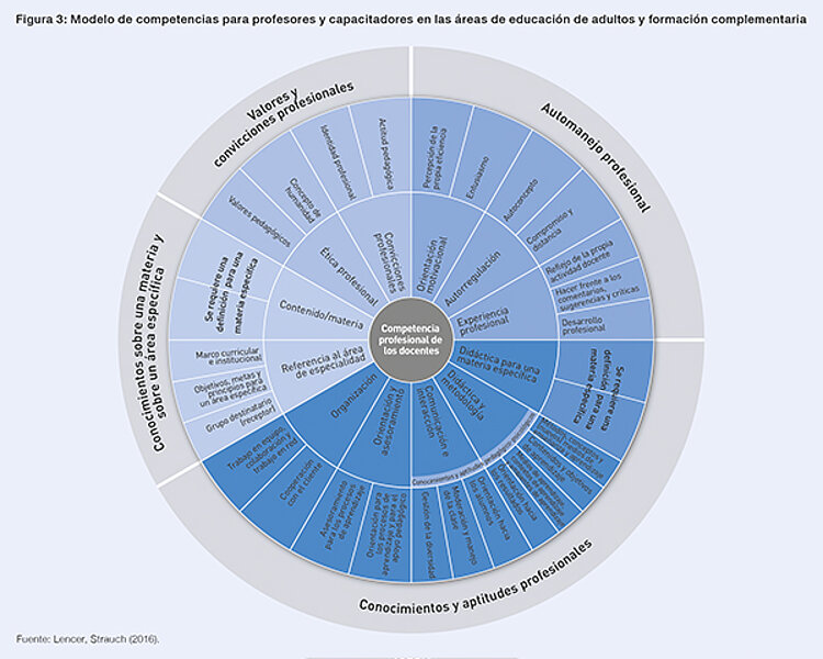 En el modelo se consideran las competencias de profesores y capacitadores para impartir educación de adultos y no, por ejemplo, las aptitudes técnicas de los profesores (profesores de informática, idiomas, deportes, etc.). En ningún caso se pasan por alto las competencias didácticas y aquellas relacionadas con la materia; ellas aparecen en el modelo como áreas “que deben ser definidas específicamente en función de la materia”. El modelo puede servir de referencia para una serie de objetivos: ofrece la oportunidad de obtener una visión general de las competencias que resultan aplicables a nuestra propia enseñanza, en las cuales aún puede haber algunas lagunas. Desde la perspectiva de las instituciones de formación complementaria, el modelo puede resultar de utilidad para evaluar y perfeccionar las aptitudes del cuerpo docente. En aquellas áreas donde se detecta un déficit de competencias, el problema puede abordarse de manera sistemática mediante una capacitación adecuada. Además, el modelo puede servir como referencia al indicar las competencias que debe poseer el personal docente para enseñar en una institución específica de formación complementaria, o para trabajar en una determinada área (por ejemplo, educación familiar, formación profesional, etc.). El modelo de competencias también puede utilizarse para respaldar la contratación de personal y como criterio de referencia para las entrevistas asociadas a la selección y el perfeccionamiento del personal.