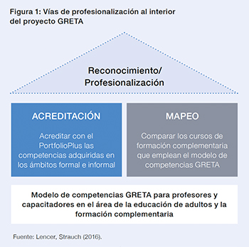 Las estructuras para acreditar las competencias de profesores y capacitadores en materia de educación de adultos fueron desarrolladas sobre una base científica, y las condiciones para promover el perfeccionamiento profesional fueron generadas a través de dos vías. Por un lado, es necesario capacitar a los capacitadores para documentar —y lograr que se les acrediten— las competencias que han adquirido previamente en los ámbitos no formal e informal. Por otro lado, es preciso ofrecer una formación complementaria en relación con el modelo de competencias (mapeo) y, por tanto, los profesores y capacitadores deben ser informados de manera focalizada sobre posibilidades adicionales para su profesionalización. Ambos enfoques se basan en un modelo uniforme de competencias que abarca a los diversos proveedores de formación para profesores y capacitadores en el área de la educación permanente y de adultos.