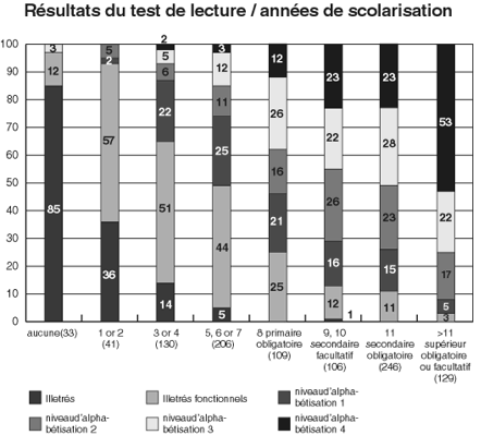 67,1 % disposent au moins d’un niveau d’alphabétisation élémentaire et peuvent être classés à l’un des quatre niveaux d’aptitude à la compréhension. Il a été démontré que les gens qui se servent le plus de la lecture et de l’écriture, aussi bien au travail que dans la vie quotidienne, sont également ceux qui se classent aux deux plus hauts niveaux d’aptitude (33 % de l’échantillon). Ceci correspond à l’aptitude à établir un rapport entre les différentes informations et à tirer des conclusions lors de la lecture de textes plus complexes, mais aussi à la capacité de refaire les calculs (y compris ceux des tableaux) que ceux-ci peuvent contenir et de comprendre leur vocabulaire spécialisé (de la génétique ou de l’écologie par exemple) et les concepts généraux de statistiques et d’arithmétique. La majorité de ces gens avait au moins fait des études secondaires et se composait par exemple d’employés de bureau, d’employés de banque ou de techniciens, ou exerçait une profession libérale.