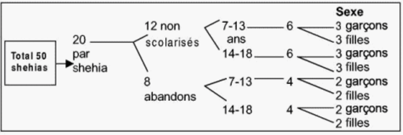Un plan d'interviews approfondies a également été établi pour analyser la situation, évaluer le nombre d'enfants non scolarisés et identifier leurs besoins. Cet instrument de recherche approfondie a été appliqué à un échantillon représentatif dans chacune des cinq régions et chacun des dix districts. Une approche anticipatrice a été utilisée pour inciter les enfants non scolarisés à réfléchir sur l'écart entre leurs désirs (avenir professionnel p. ex.) et la réalité (préoccupations). Cet écart engendre évidemment des problèmes que le projet éducatif alternatif en faveur des enfants non scolarisés devrait être en mesure de résoudre. Dans l'ensemble, il était prévu d'interviewer 20 personnes dans chaque shehia (N = 50), ce qui donnait une population de 1000 interviewés en fonction de leur sexe et de leur situation éducative. Le ratio adopté entre les enfants non scolarisés et les abandons scolaires était respectivement de 3:2. Ainsi, dans chaque shehia échantillonnée, l'étude a atteint 12 enfants sur 20 en ce qui concerne les non scolarisés, et 8 enfants ayant abandonné l'école, par sexe et groupe d'âge.