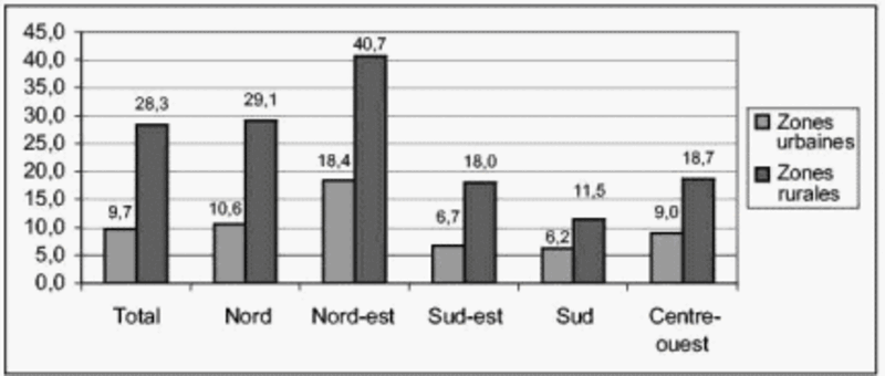 Parallèlement aux recensements organisés tous les dix ans, l'Institut brésilien géographique des statistiques (IBGE) effectue des sondages nationaux auprès des petits agriculteurs (PNAD). Les taux d'analphabétisme sont calculés sur la base d'auto-évaluations sur la capacité des interviewés à lire et écrire un message simple dans une langue qui leur est familière1. Dans les années 1990 et suivant une recommandation de l'UNESCO, NBGE a également commencé à recenser les taux d'analphabétisme fonctionnel en prenant comme base le nombre d'années de scolarité. Selon ce critère, 33 millions de Brésiliens de 15 ans et plus étaient analphabètes fonctionnels en 2001, ce qui représente 27,3 % de la population de ce groupe d'âge (INEP, 2003b).