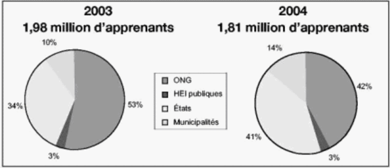 L'alphabétisation des adultes et les formations des jeunes et des adultes, YAE, sont particulièrement touchées par le manque d'argent. L'aide internationale dans ce domaine est pratiquement inexistante au Brésil. Certaines données de 1995 indiquent que les formations YAE reçoivent 1,4 % des dépenses publiques réservées au secteur éducatif aux trois niveaux gouvernementaux (Abrahâo e Fernandez, 1999). Selon la même source, la part des dépenses du gouvernement fédéral dans la formation des jeunes et des adultes a été de 9,2 % cette même année, alors que celle des États et des municipalités était respectivement de 62,3 %et28,4 %. Aucune donnée ne nous permet d'estimer le montant des fonds publics investis plus récemment dans la formation des jeunes et des adultes, problème supplémentaire qui vient s'ajouter au manque pratiquement total d'informations sur la part des investissements non gouvernementaux dans ce secteur.