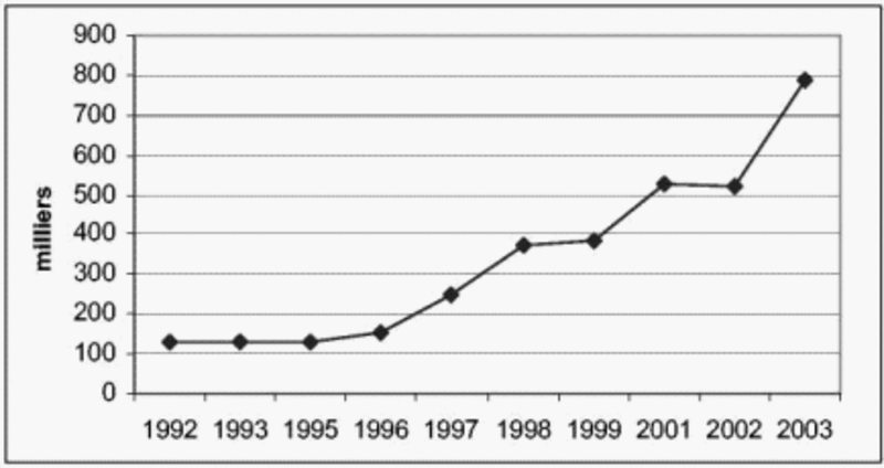 Selon la PNAD, le nombre de participants à des formations d'adultes a augmenté au cours de la dernière décennie, plus particulièrement à partir de 1996 puis en 2003, date à laquelle le gouvernement fédéral a entrepris des initiatives dans ce domaine (graphique 3). En 2003, 786000 personnes ont participé à des cours d'alphabétisation pour adultes, ce qui représente 5,3 % des personnes s'étant déclaré illettrées la même année (14,6 millions); 72 % des participants vivaient dans des zones urbaines et 59 % dans le nord, 63 % étant des femmes, 71 % des descendants d'Africains et 71 % ayant plus de 35 ans (SECAD/MEC 2005).