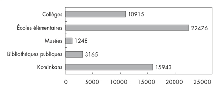 Les activités éducatives organisées dans les kominkans se répartissent en gros de la manière suivante: les activités initiées par les kominkans et celles mises en oeuvre par les groupes ou les individus qui utilisent les kominkans. Les chiffres indiqués ici correspondent aux cours prévus et organisés par les kominkans.