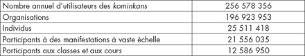 Selon la même enquête, le nombre annuel des participants aux activités des kominkans s’élève à 256, 578, 356. Le Japon ayant une population de 120 millions d’habitants, cela signifie que chaque Japonais participe en moyenne deux fois par an à des activités des kominkans.