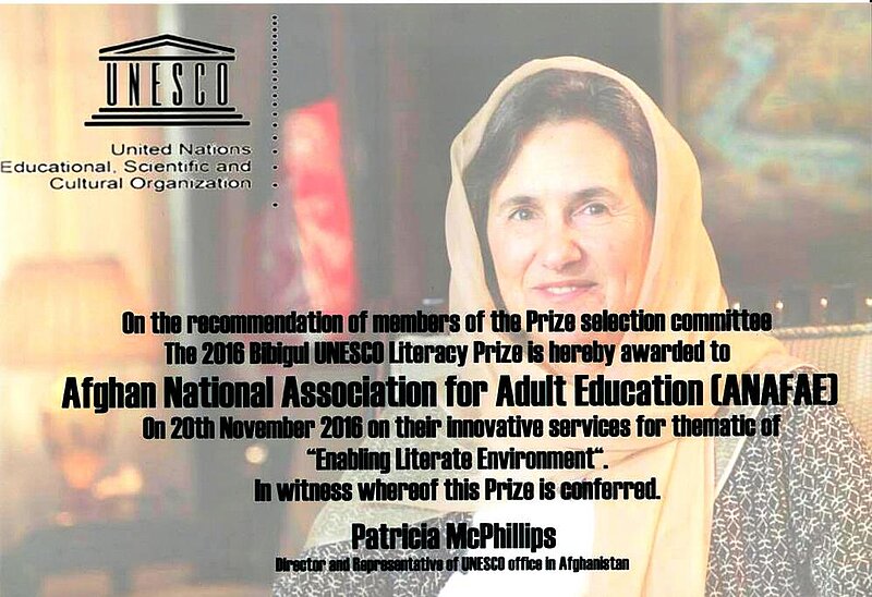 The UNESCO Literacy Award is called “Bibi Gul Literacy Prize” after the Afghan First Lady, Bibi Gul. It was received by the Afghan National Association for Adult Education, ANAFAE and two other national NGOs on November 20. In her speech, First Lady Bibi Gul urged all Afghan men and women to learn.