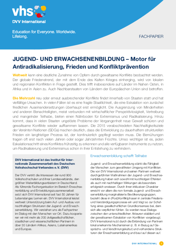 In seinem aktuellen Fachpapier diskutiert DVV International den Beitrag, den Jugend- und Erwachsenenbildung zu Antiradikalisierung, Friedensförderung und Konfliktprävention leisten kann.