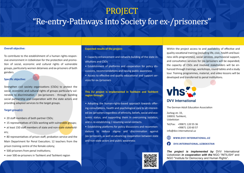 Das Büro von DVV International in Usbekistan kann bei diesem Projekt auf seine gut etablierten lokalen Partner bauen. Diese bringen umfangreiche Expertise in der Arbeit mit der Zielgruppe der (Ex-)Inhaftierten und im Schutz ihrer Menschenrechte sowie ihrem Zugang zu verschiedenen Lebensbereichen wie Arbeit, Gesundheitsversorgung, Rechtsberatung etc. mit.