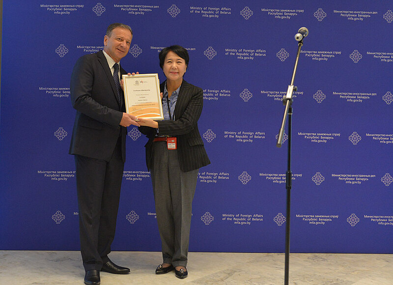 An der Veranstaltung nahmen zahlreiche Botschafter, belarussische Regierungsmitglieder, Parlamentarierinnen und Parlamentarier sowie Vertreterinnen und Vertreter von DVV International und des UIL teil. Professor Un Shil Choi, Mitglied des UIL-Vorstandes, überreichte die Mitgliedsurkunde des globalen Netzwerks an Viktor Nikolaykin, den Bürgermeister der Stadt Witebsk.